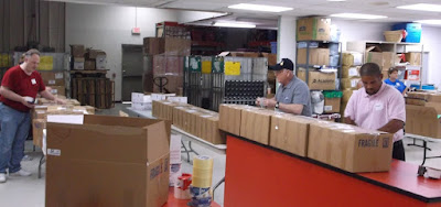 Volunteers preparing to pack care packages for U.S. troops overseas.